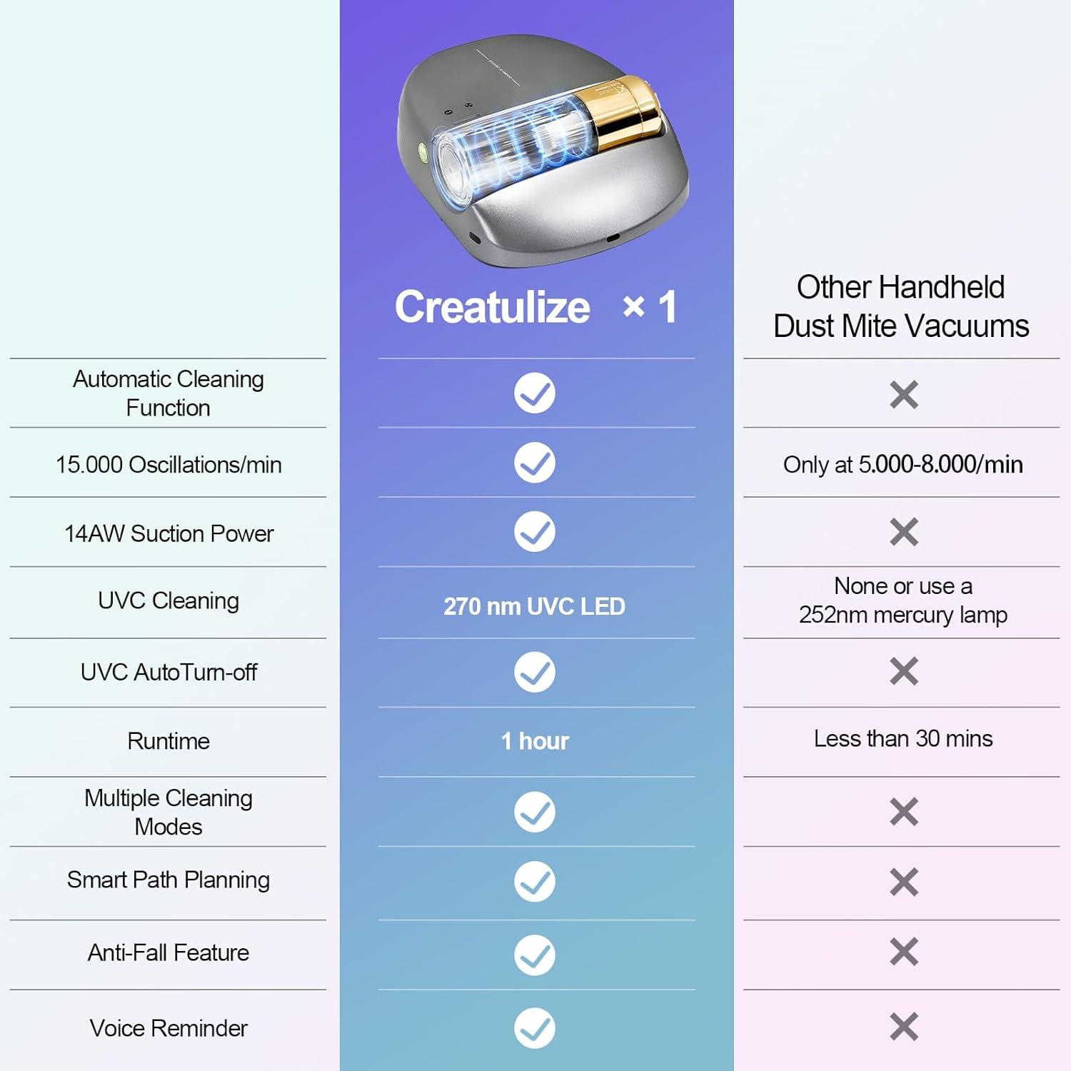 - Powerful Cleaning Ability: 14AW strong suction and Four 270nm UV-C deep purple lamps paired with high-frequency spiral brushes 15,000/min for tapping can absorb deep dust and allergens from bed.Ensure deep cleaning and safeguard the health of the home environment,for pet families, it's simply a surprise.